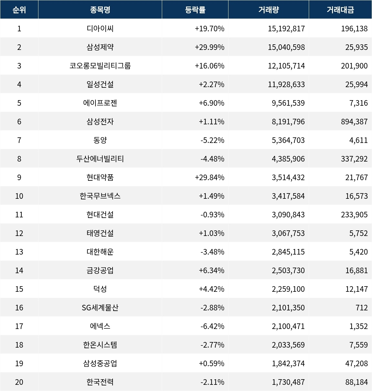 한편 거래량 상위 20위권 종목들은 현대건설(000720) ▼0.93%, 태영건설(009410) ▲1.03%, 대한해운(005880) ▼3.48%, 금강공업(014280) ▲6.34%, 덕성(004830) ▲4.42%, SG세계물산(004060) ▼2.88%, 에넥스(011090) ▼6.42%, 한온시스템(018880) ▼2.77%, 삼성중공업(010140) ▲0.59%, 한국전력(015760) ▼2.11% 등의 성적을 기록한다.