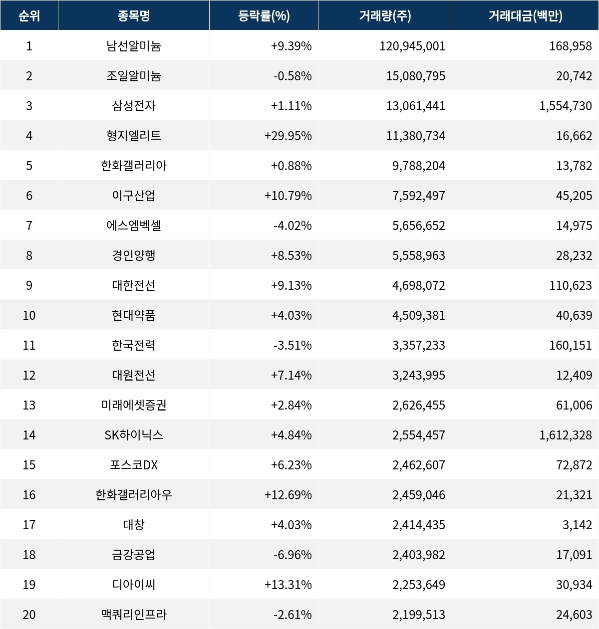 한편 거래량 상위 20위권 종목들은 한국전력(015760) ▼3.51%, 대원전선(006340) ▲7.14%, 미래에셋증권(006800) ▲2.84%, SK하이닉스(000660) ▲4.84%, 포스코DX(022100) ▲6.23%, 한화갤러리아우(45226K) ▲12.69%, 대창(012800) ▲4.03%, 금강공업(014280) ▼6.96%, 디아이씨(092200) ▲13.31%, 맥쿼리인프라(088980) ▼2.61% 등의 성적을 기록한다.