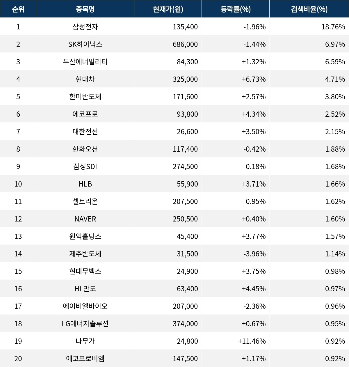 이 밖에도 나무가(190510) ▲11.46%, HL만도(204320) ▲4.45%, 현대무벡스(319400) ▲3.75%, 원익홀딩스(030530) ▲3.77%, 제주반도체(080220) ▼3.96%, 에이비엘바이오(298380) ▼2.36%, 셀트리온(068270) ▼0.95%, NAVER(035420) ▲0.40%, LG에너지솔루션(373220) ▲0.67%, 에코프로비엠(247540) ▲1.17% 등이 많이 검색되고 있다.
