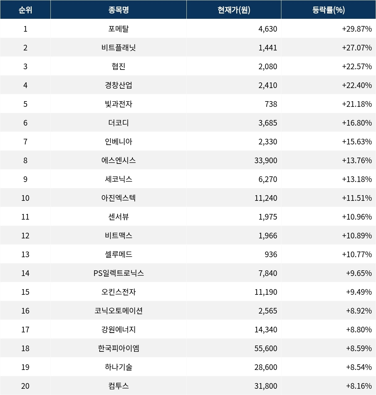 6위 더코디(224060)는 현재가 3685원으로 16.80% 상승 중이다. 7위 인베니아(079950)는 현재가 2330원으로 15.63% 상승 중이다. 8위 에스엔시스(0008Z0)는 현재가 3만 3900원으로 13.76% 상승 중이다. 9위 세코닉스(053450)는 현재가 6270원으로 13.18% 상승 중이다. 10위 아진엑스텍(059120)은 현재가 1만 1240원으로 11.51% 상승 중이다.