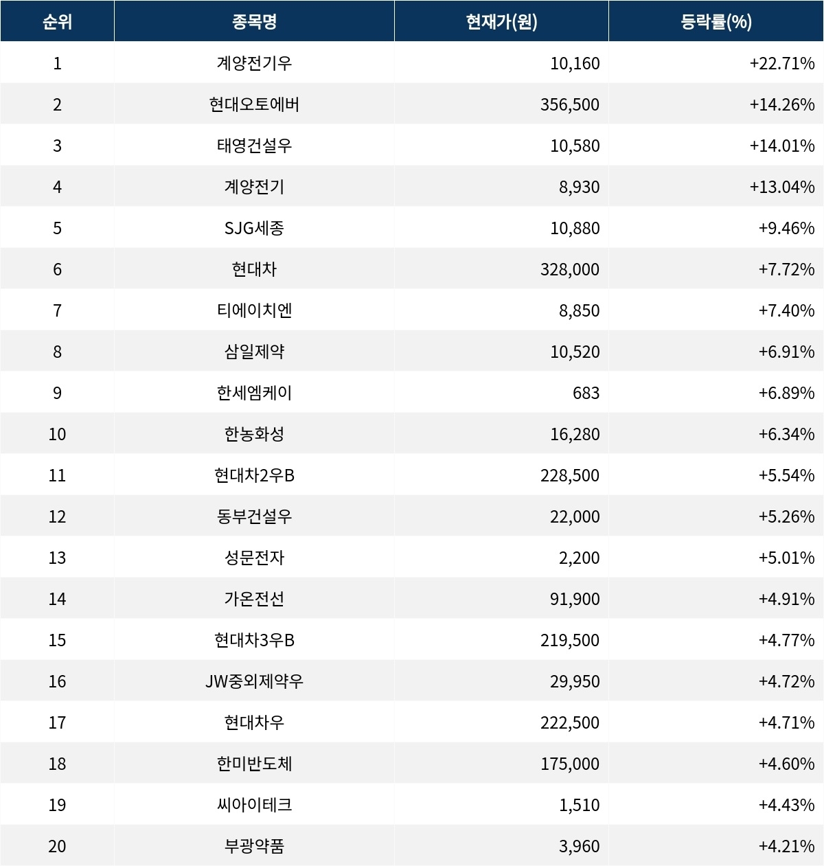 6위 현대차(005380)는 현재가 32만 8000원으로 7.72% 상승 중이다. 7위 티에이치엔(019180)은 현재가 8850원으로 7.40% 상승 중이다. 8위 삼일제약(000520)은 현재가 1만 520원으로 6.91% 상승 중이다. 9위 한세엠케이(069640)는 현재가 683원으로 6.89% 상승 중이다. 10위 한농화성(011500)은 현재가 1만 6280원으로 6.34% 상승 중이다.