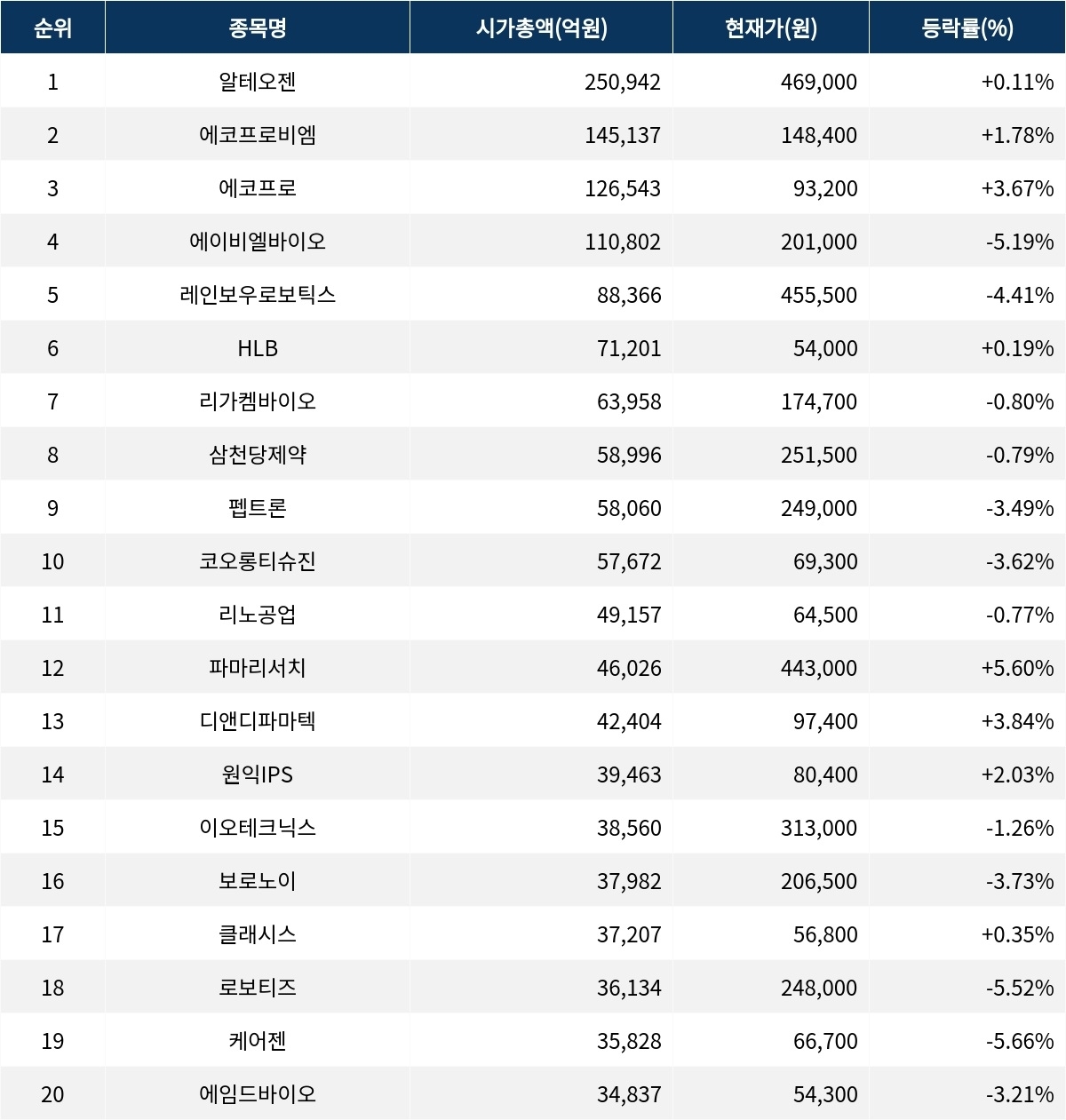 한편 시가총액 20위권 종목들은 리노공업(058470) ▼0.77%, 파마리서치(214450) ▲5.60%, 디앤디파마텍(347850) ▲3.84%, 원익IPS(240810) ▲2.03%, 이오테크닉스(039030) ▼1.26%, 보로노이(310210) ▼3.73%, 클래시스(214150) ▲0.35%, 로보티즈(108490) ▼5.52%, 케어젠(214370) ▼5.66%, 에임드바이오(0009K0) ▼3.21% 등의 성적을 기록하고 있다.