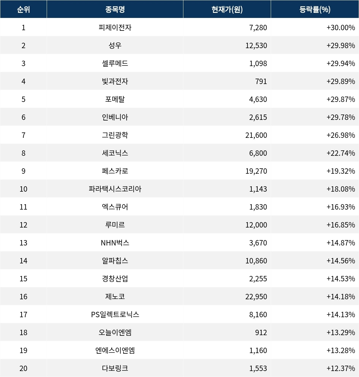 이어 상승률 2위 성우(458650)는 주가가 29.98% 급등하며 종가 12,530원에 상승 마감했다. 상승률 3위 셀루메드(049180)의 주가는 1,098원으로 29.94% 폭등하며 강세를 보였다. 상승률 4위 빛과전자(069540)는 29.89% 급등하며 791원에 마감했다. 상승률 5위 포메탈(119500)은 29.87%의 급등세를 타고 종가 4,630원에 마감했다.