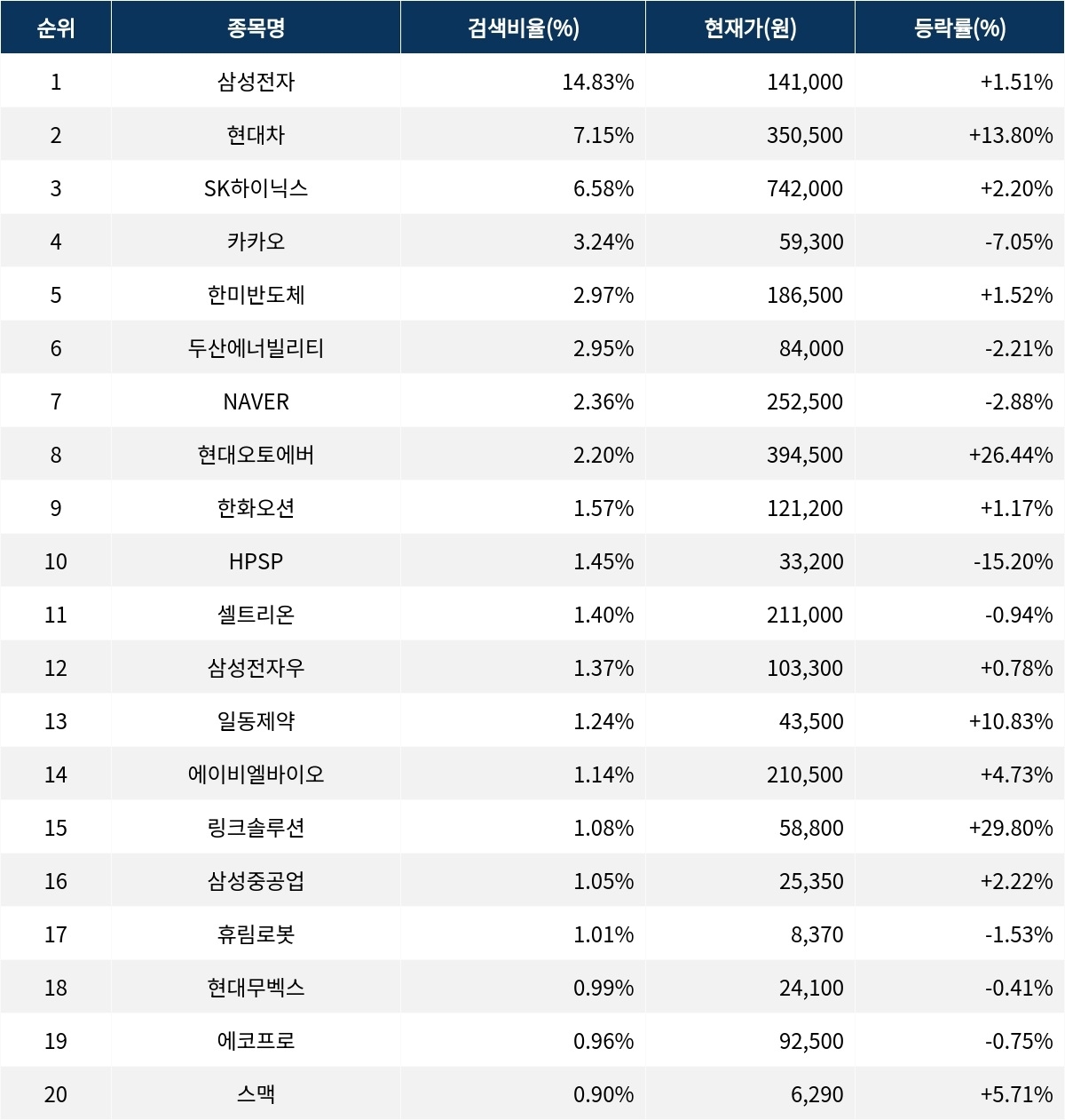 이어 검색비율 2위의 현대차(005380)는 상승률 13.80%로 급등 마감했다. 검색비율 3위의 SK하이닉스(000660)는 2.20% 상승 마감했다. 검색비율 4위 카카오(035720)는 하락률 7.05%로 하락했다. 검색비율 5위 한미반도체(042700)는 1.52% 상승했다.