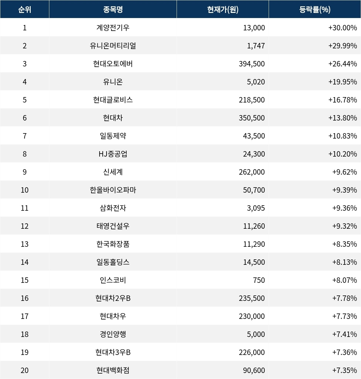 6위 현대차(005380)는 350,500원으로 13.80% 급등 마감했다. 7위 일동제약(249420)은 종가 43,500원으로 10.83% 상승 마감했다. 8위 HJ중공업(097230)은 종가 24,300원으로 10.20% 상승 마감했다. 9위 신세계(004170)는 262,000원으로 9.62% 상승 마감했다. 10위 한올바이오파마(009420)는 50,700원으로 9.39% 상승 마감했다.