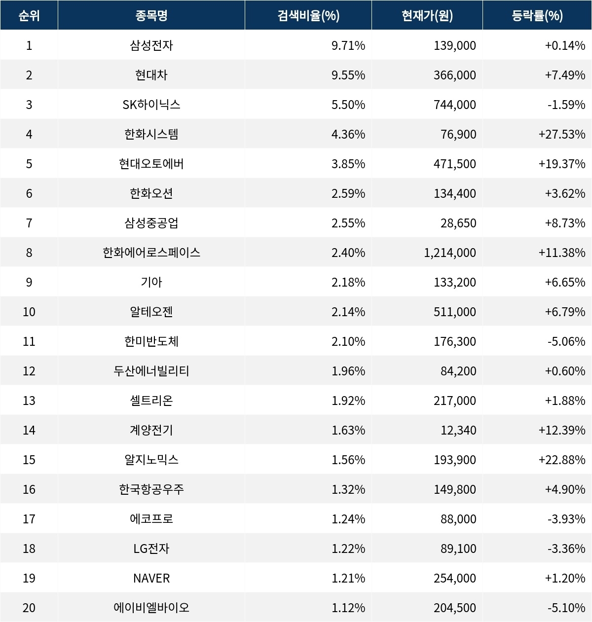 이어 검색비율 2위의 현대차(005380)는 상승률 7.49%로 상승 마감했다. 검색비율 3위의 SK하이닉스(000660)는 1.59% 하락 마감했다. 검색비율 4위 한화시스템(272210)은 폭등률 27.53%의 큰 상승폭으로 마감했다. 검색비율 5위 현대오토에버(307950)는 19.37% 급등하며 거래를 마쳤다.