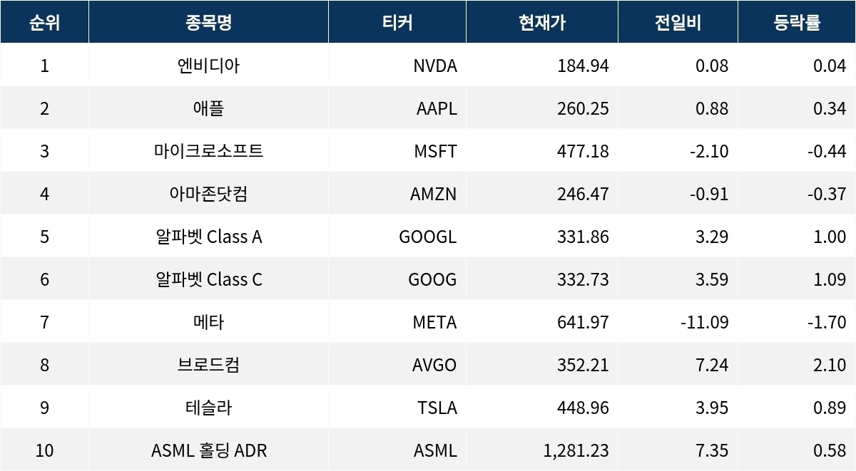 엔비디아는 0.04% 상승한 184.94달러로 거래를 마쳤다. 애플은 0.34% 상승하여 260.25달러를 기록했다. 마이크로소프트는 0.44% 하락하여 477.18달러에 머물렀다.
