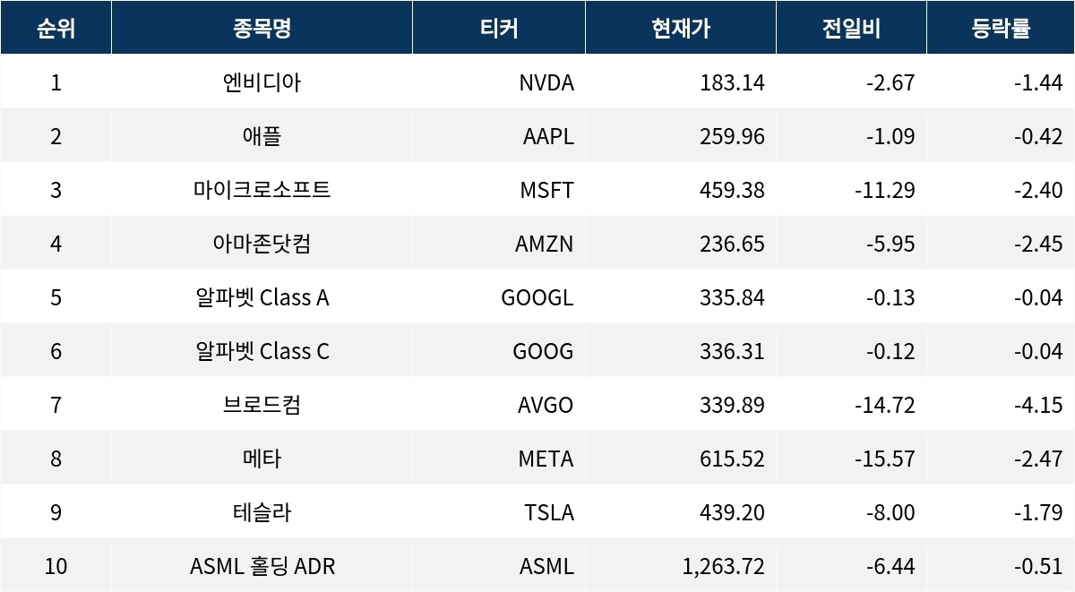 엔비디아(NVDA)는 -1.44% 하락한 183.14달러에 거래를 마쳤다. 마이크로소프트(MSFT)는 -2.40% 하락하여 459.38달러를 기록했다. 브로드컴(AVGO)은 -4.15%로 가장 큰 폭의 하락세를 보이며 339.89달러에 마감했다.