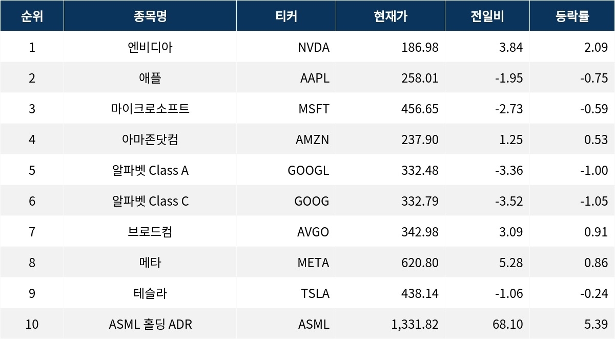 엔비디아는 186.98 달러로 전일 대비 2.09% 상승하며 긍정적인 흐름을 이어갔다. 애플은 258.01 달러로 0.75% 하락했다. 마이크로소프트는 456.65 달러로 0.59% 하락했다.