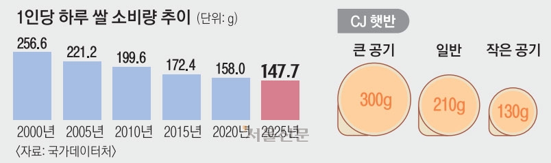 쌀 소비량은 1985년(128.1㎏) 이후 40년째 감소세를 이어가고 있다. 30년 전인 1995년(106.5㎏)과 비교하면 반토막이 났다. 하루 소비량으로 환산하면 1인당 147.7g으로, 시중에서 판매되는 즉석밥 ‘일반공기’(210g)의 약 70% 수준이다.