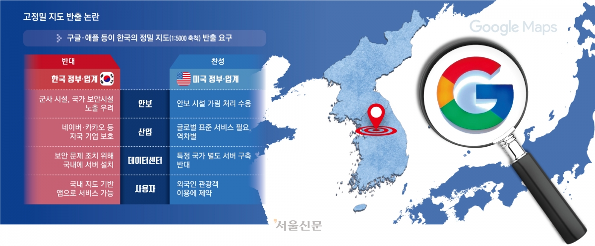 A. 군사 시설과 청와대 등 국가 보안 시설의 세부 위치와 구조가 전 세계에 공개될 수 있기 때문이다. 한국은 북한과 대치 상황에 있어 고정밀 지도가 반출되면 국가 안보에 치명적일 수 있다. 구글 측은 안보 시설을 ‘블러’(흐림) 처리하겠다고 하지만 위성 사진과 결합하면 위치 특정이 얼마든지 가능해 정부는 지금껏 반출을 불허했다. 네이버·카카오 등 토종 플랫폼의 경쟁력을 지키기 위한 반대라는 시선도 있다. 구글 측은 역차별이라고 주장한다. 미국이 지난해 관세협상 과정에서 이 고정밀 지도 반출 문제를 ‘비관세 장벽’으로 규정하고 압박한 것도 이 때문이다.