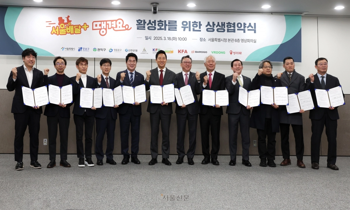 지난해 서울시청에서 열린 서울시 공공배달 서비스 ‘서울배달+땡겨요’ 활성화를 위한 상생협약식에서 오세훈 서울시장(왼쪽 다섯번째)과 참석자들이 협약서에 서명한 뒤 기념촬영을 하고 있다.