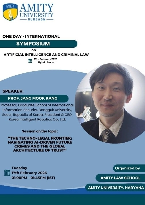 인도의 수도 뉴델리 인근 구르가온에 있는 Amity 법과대학은 2026년 2월 17일 오후, 유엔 SDG 제4호(양질의 교육), 제9호(산업·혁신·인프라), 제16호(평화·정의·강한 제도)를 내걸고 ‘인공지능과 형사법에 관한 국제 심포지엄’을 열었다. 이 자리에 강 교수가 기조연설자로 초청됐다.