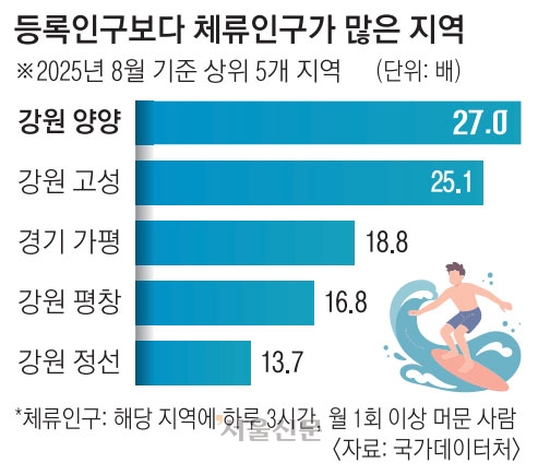 국내 서핑족의 ‘성지’가 된 강원 양양군에 지난해 체류했던 인구가 등록인구의 27배에 이른 것으로 나타났다. 패러글라이딩 메카로 불리는 충북 단양 등 인구감소지역 20곳에서는 체류인구가 쓰는 카드 사용액 비중이 전체 50%를 넘었다. 외지인이 현지인보다 더 많은 돈을 썼다는 의미다. 체류인구가 꺼져가는 지역 경제에 숨을 불어넣는 주체로 부상하면서 인구 감소로 소멸 위기에 처한 지방자치단체들의 새로운 생존 대안이 될 수 있을지 주목된다.