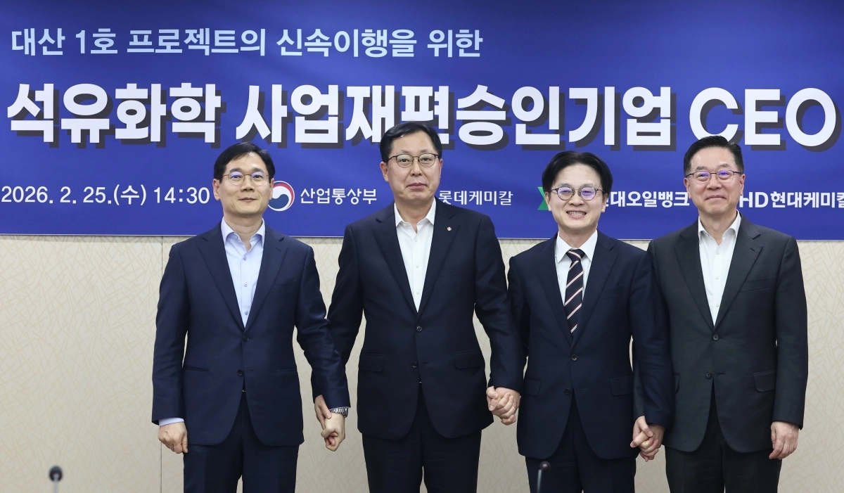 김정관 산업통상자원부 장관이 25일 대산 1호 프로젝트의 신속이행을 위한 석유화학 사업재편승인기업 CEO 간담회에서 기념 촬영하고 있다. 왼쪽부터 조남수 HD현대케미칼 대표, 이영준 롯데케미칼 대표, 김 장관, 송명준 HD현대오일뱅크 대표.