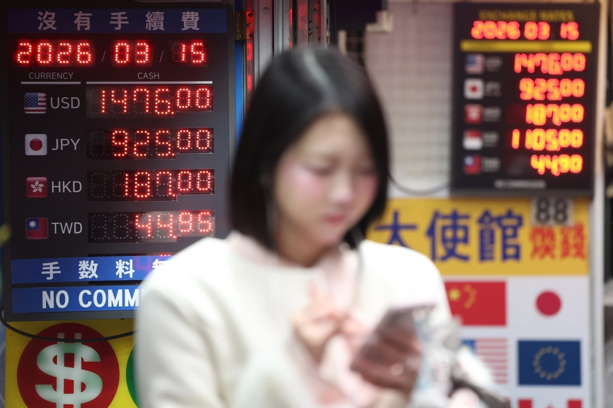 중동 전쟁 여파로 이달 원화 하락률은 3.84%로 주요국 통화 대비 가장 큰 폭으로 하락했다. 원달러 환율 평균이 1470원을 넘으며 외환위기 이후 최고치를 기록했다. 사진은 15일 서울 명동거리의 환전소 모습. 연합뉴스