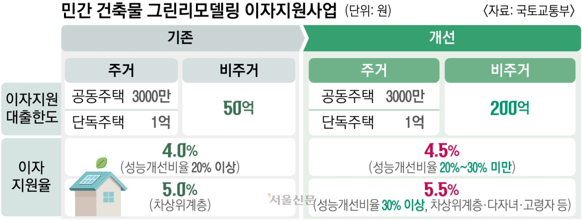 먼저 기본 이자 지원율을 4.0%에서 4.5%로 상향한다. 에너지 성능 개선 비율이 높거나(30% 이상) 차상위계층·다자녀·고령자·신혼부부에 해당하면 1% 포인트를 추가해 5.5%까지 지원한다. 또 비주거 대형 건축물에 대한 지원 한도를 50억원에서 200억원으로 대폭 확대한다.