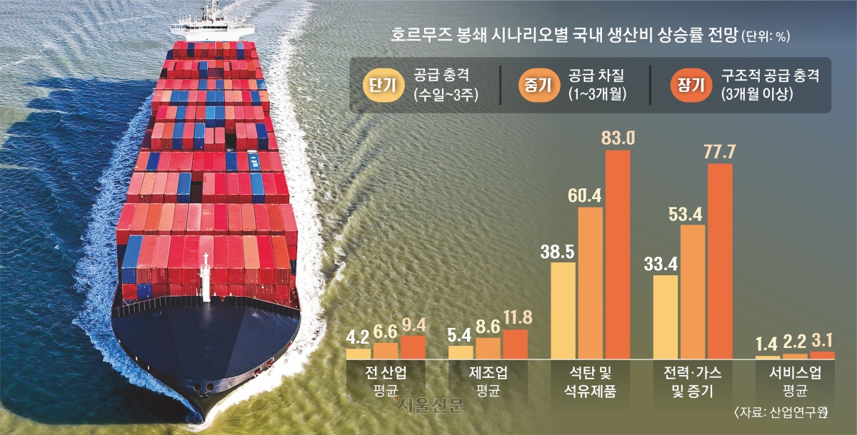 에너지의 대부분을 수입하는 우리나라 제조업에도 여파가 클 것으로 보인다. 보고서가 원유·LNG 가격 상승이 산업별 생산 비용에 미치는 직간접 파급효과를 추정한 결과, 해협 봉쇄가 3주 이내 끝날 경우 한국의 전 산업 평균 생산비는 4.2%, 제조업 생산비는 5.4% 상승할 것으로 추산됐다. 가장 큰 타격을 입는 석탄·석유 제품은 해협 봉쇄가 3개월 이상이면 83%까지 생산비가 상승할 것으로 추산됐다. 전력·가스 및 증기 생산비 역시 3개월 이상 봉쇄 때 77.7% 증가할 것으로 전망됐다. 우리나라 주력 수출품인 반도체와 자동차의 경우 직접적인 비용 충격은 비교적 낮지만, 핵심 원자재의 물량 차질이 발생할 경우 충격이 확대될 가능성도 있다.