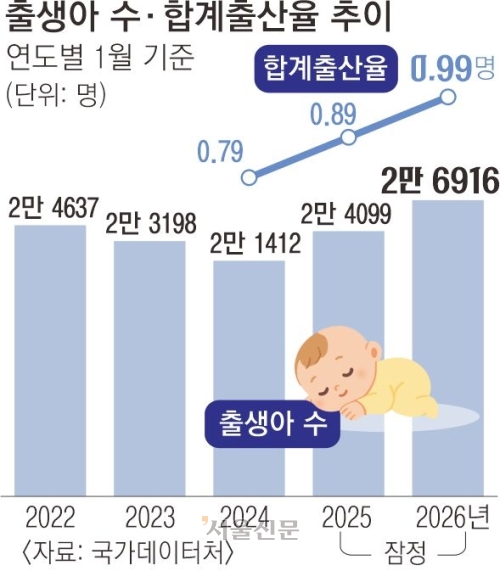 지난 1월 태어난 아기가 2만 6000명을 넘어서며 7년 만에 최대치를 기록했다. 합계출산율도 0.99명까지 치솟으며 ‘마의 1명대’ 회복을 목전에 뒀다. 출생의 선행 지표인 혼인 건수 역시 2024년 4월부터 연속 증가세를 이어 가고 있어 출생아 수 증가 추세가 당분간 이어질 것이라는 전망이 나온다.