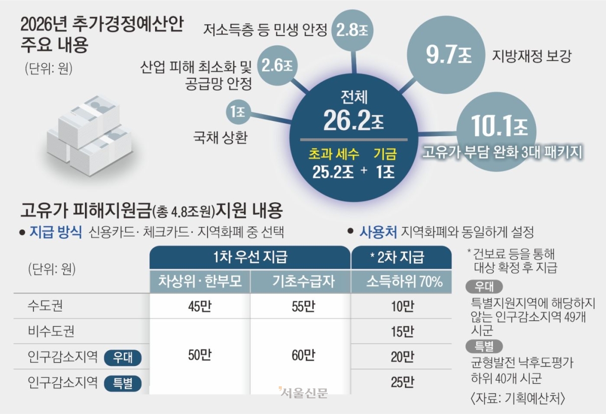 정부는 31일 국무회의를 열고 26조 2000억원 규모의 ‘중동전쟁 위기 극복을 위한 추가경정예산(추경)안’을 심의·의결했다. 올해 기획재정부로부터 분리·신설된 기획예산처가 내놓은 첫 번째 추경이자, 이재명 정부 출범 이후 두 번째 추경이다. 유가 급등으로 민생 경제 타격이 본격화하자 기획처는 역대 최단기간인 19일 만에 추경 편성 작업을 마쳤다. 지금까지는 40일가량 걸리는 게 일반적이었다. 박홍근 기획처 장관은 “경기 회복의 불씨가 꺼지지 않도록 신속한 재정 지원이 필요하다고 판단했다”고 말했다.