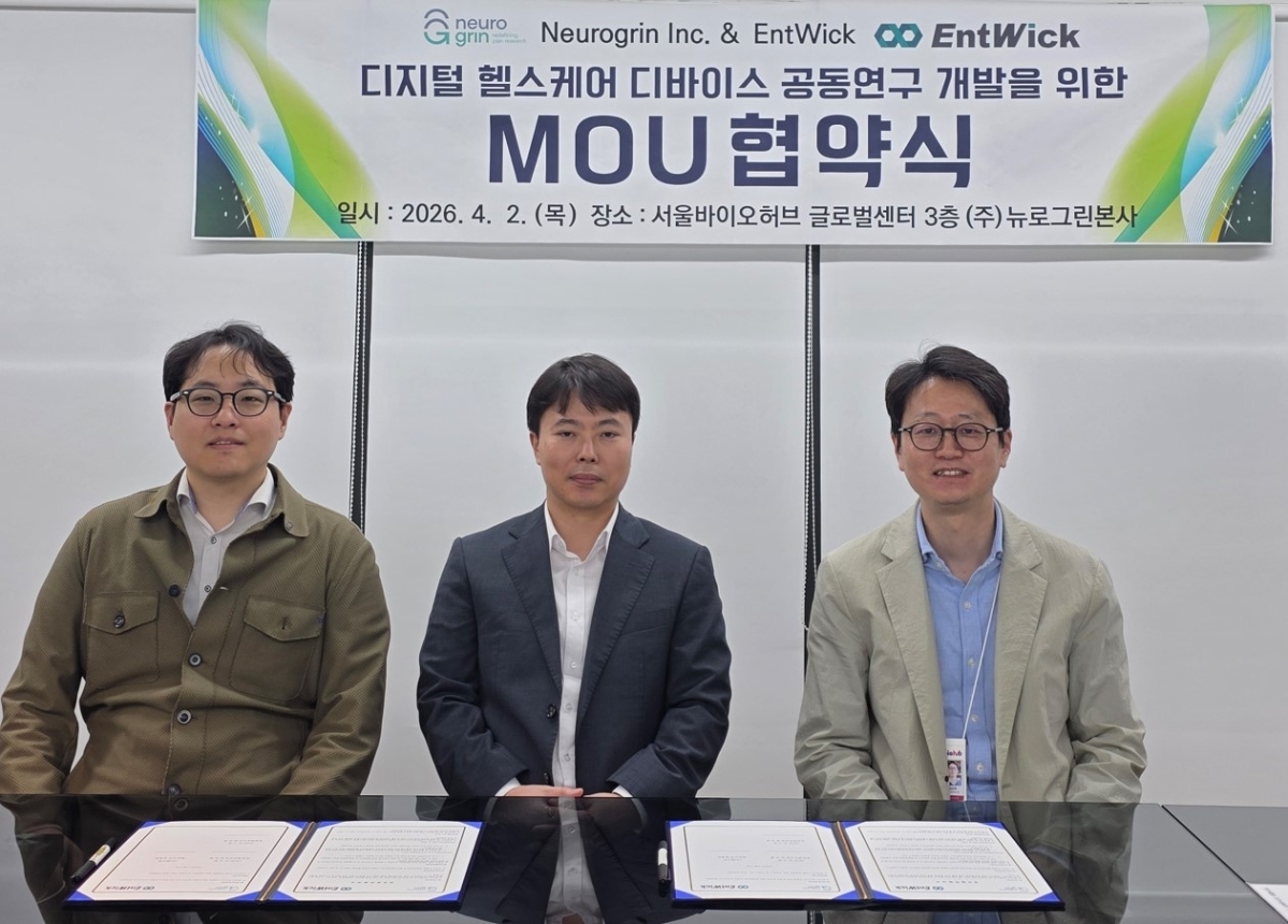 뉴로그린(Neurogrin)과 엔트윅(EntWick)은 디지털 헬스케어 디바이스 공동연구를 위한 업무협약(MOU)을 체결했다고 밝혔다.