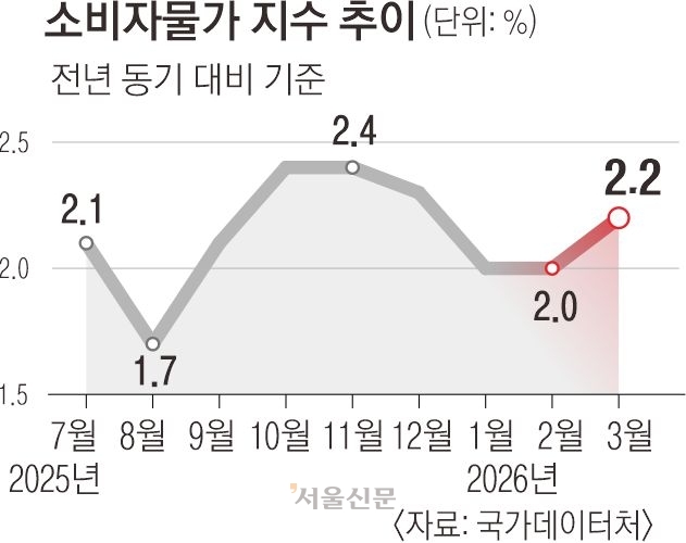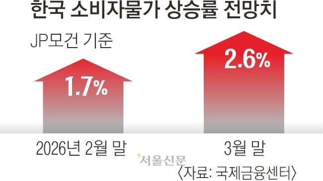 가장 높은 전망치인 2.6%를 제시한 JP모건은 지난 2일 보고서에서 “중동발 에너지 충격이 아직 지표에 충분히 반영되지 않았다”며 “상황이 개선되지 않으면 5~9월 소비자물가 상승률이 3%를 웃돌 것”이라고 내다봤다. 씨티도 “4~9월 물가 상승률이 2.8~3.3% 수준에 머물 가능성이 크다”고 전망했다.
