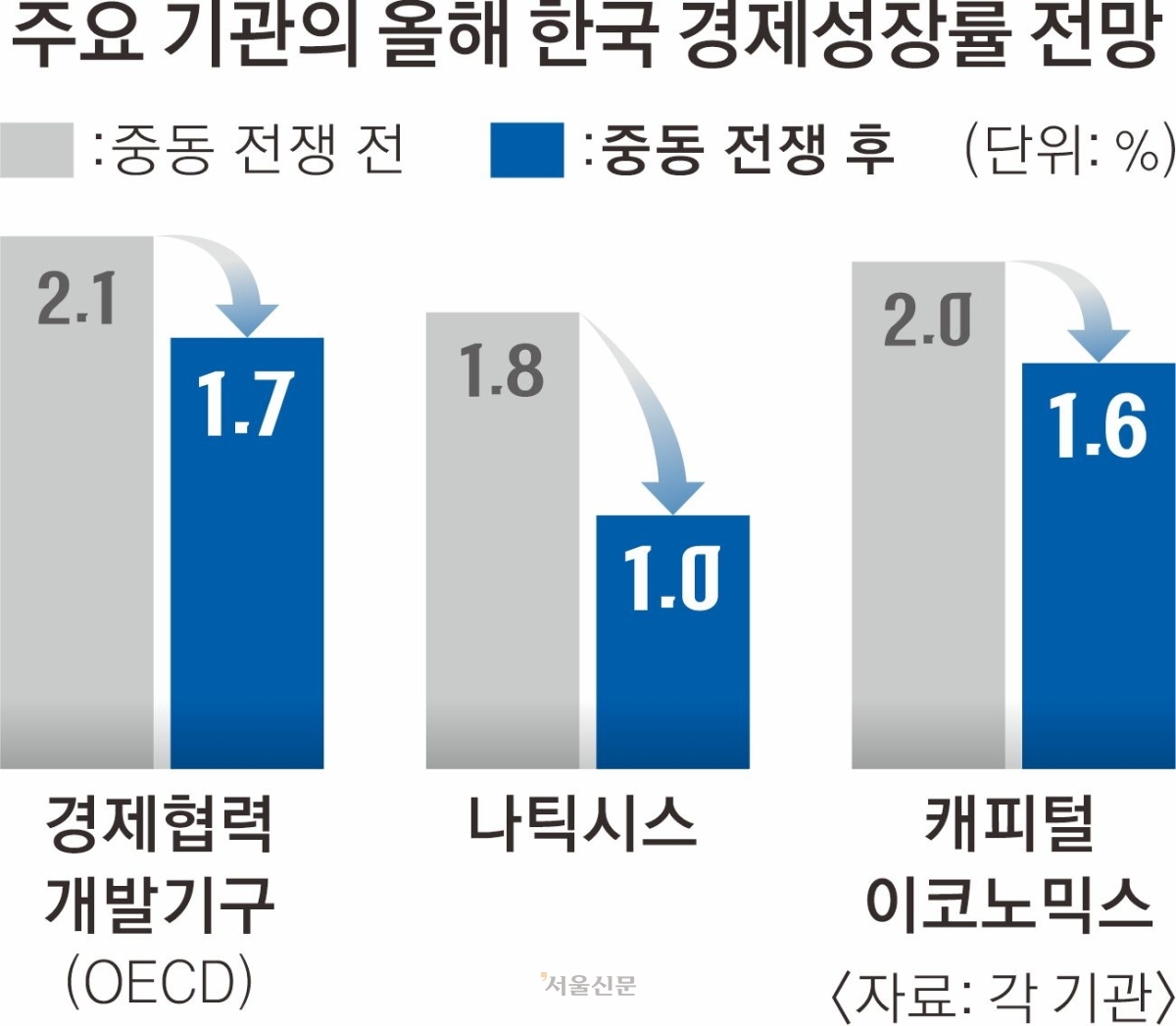앞서 경제협력개발기구(OECD)는 중동전쟁 이후 내놓은 보고서에서 한국의 성장률 전망치를 2.1%에서 1.7%로 0.4% 포인트 낮춰 잡았는데, 이보다 0.7% 포인트 더 낮은 수치다. 올해 한국의 소비자물가 상승률은 4.2%로 전망했다.