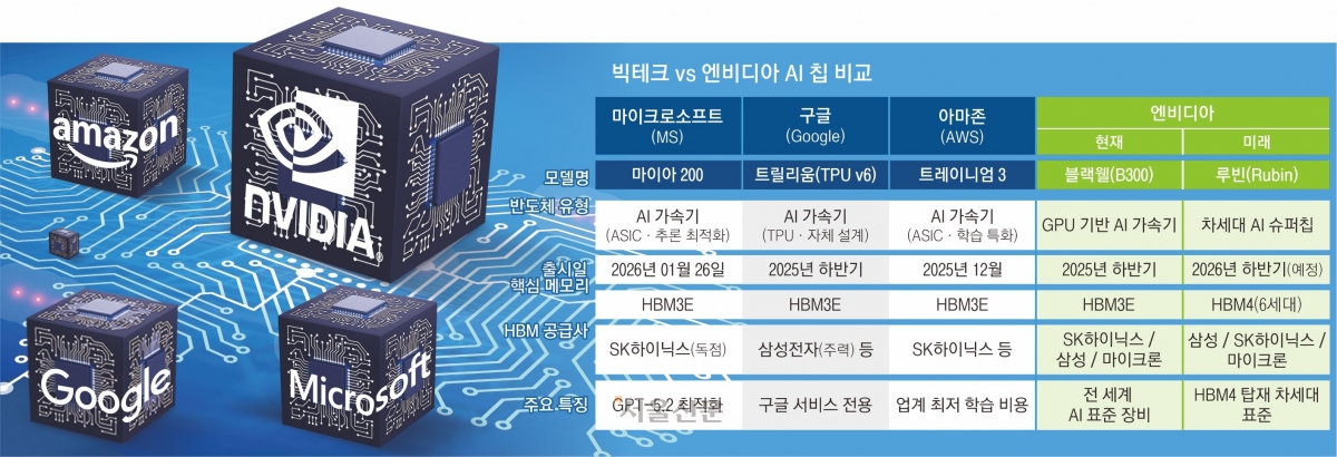 글로벌 인공지능(AI) 반도체 시장이 범용 성능을 앞세운 ‘엔비디아 표준’과 비용·전력 효율을 극대화한 ‘빅테크 전용 칩’ 간에 2차 경쟁 국면으로 진입했다. 구글과 아마존에 이어 마이크로소프트(MS)까지 독자 AI 가속기를 공개하며 자체 칩 생태계를 확대한 가운데, SK하이닉스가 MS의 신규 가속기에 고대역폭메모리(HBM)를 단독 공급하는 등 우리나라 반도체 산업의 선전은 계속될 전망된다.