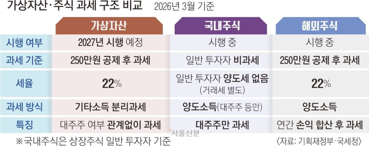 논란의 핵심은 자산별 과세 기준 차이다. 국내 상장주식은 대주주가 아니면 양도차익에 세금이 없고, 해외주식은 연간 손익을 합쳐 실제 이익에만 과세한다. 반면 가상자산은 ‘기타소득’으로 분류돼 별도로 세금을 매긴다.