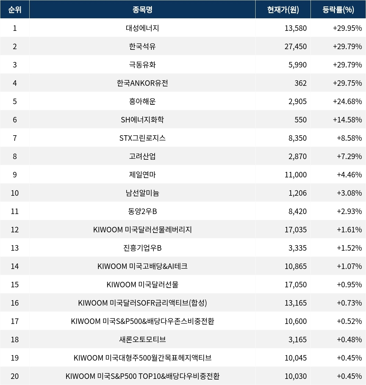 이어 상승률 2위 한국석유(004090)는 주가가 29.79% 폭등하며 종가 27,450원에 상승 마감했다. 상승률 3위 극동유화(014530)의 주가는 5,990원으로 29.79% 폭등하며 강세를 보였다. 상승률 4위 한국ANKOR유전(152550)은 29.75% 폭등하며 362원에 마감했다. 상승률 5위 흥아해운(003280)은 24.68%의 급등세를 타고 2,905원에 마감했다.