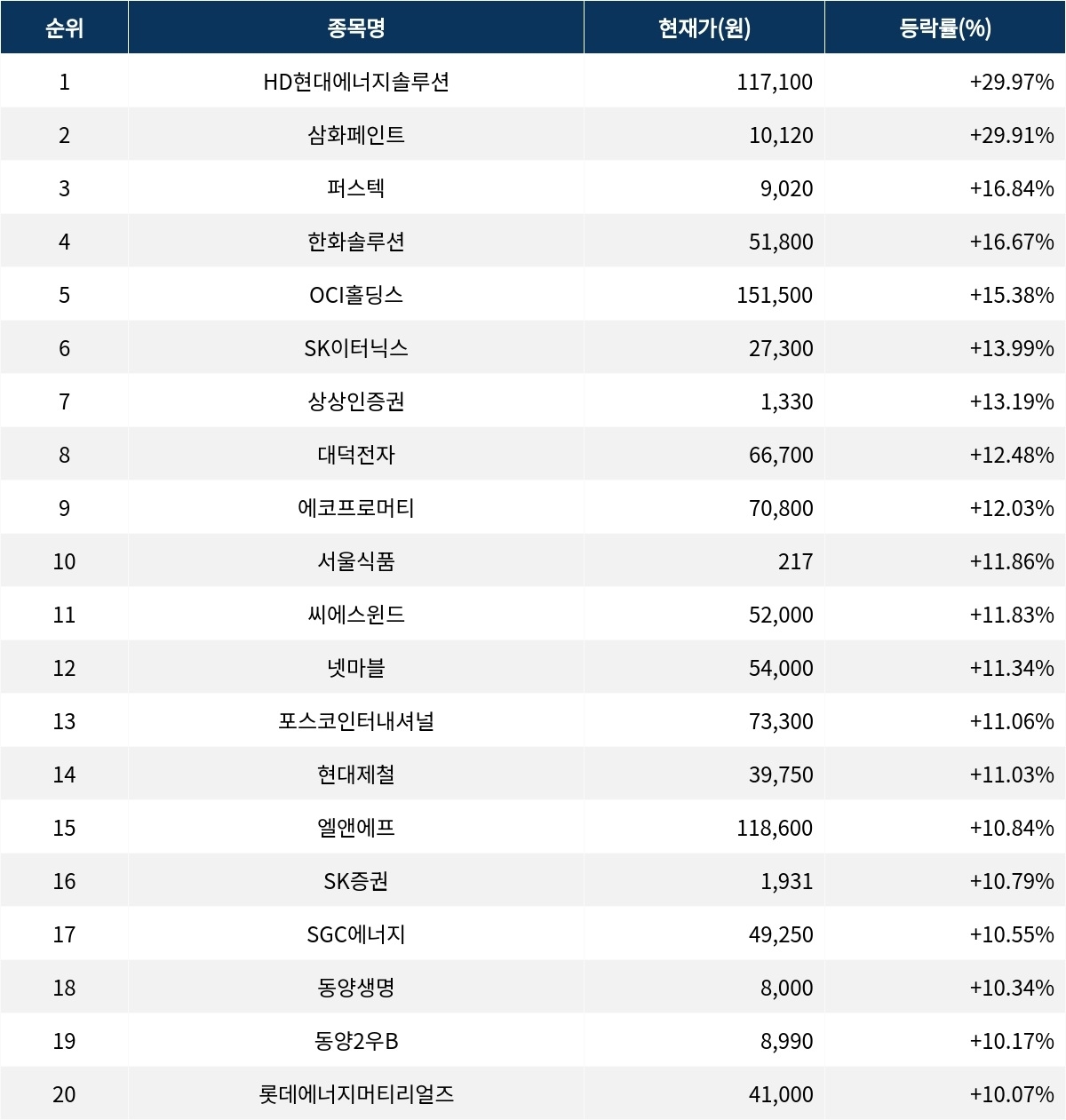 이어 상승률 2위 삼화페인트(000390)는 주가가 29.91% 올라 상한가를 기록하며 종가 1만 120원에 상승 마감했다. 3위 퍼스텍(010820)의 주가는 9020원으로 16.84% 급등하며 호조를 보였다. 4위 한화솔루션(009830)은 16.67% 급등하며 5만 1800원에 마감했다. 5위 OCI홀딩스(010060)는 15.38%의 상승세를 보이며 15만 1500원에 장을 마쳤다.