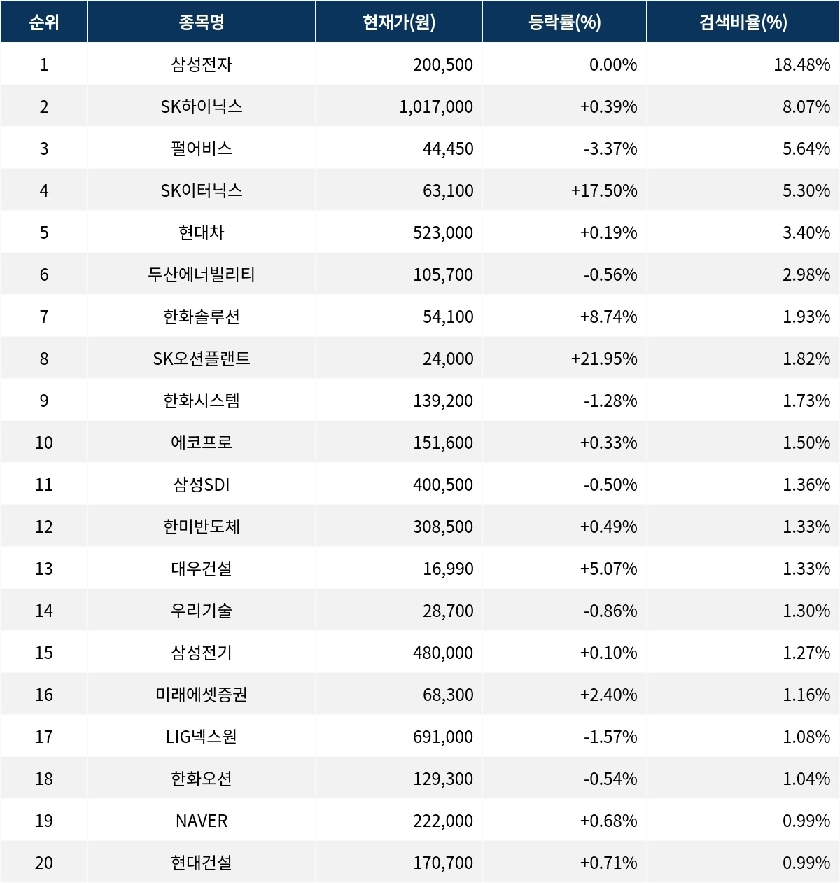 이어 SK하이닉스(000660)가 검색비율 2위를 기록하며 0.39%의 상승세를 기록하고 있다. 검색비율 3위의 펄어비스(263750)는 3.37% 하락하며 시작하고 있다. 검색비율 4위 SK이터닉스(475150)는 개장 초반부터 17.50%의 급등세를 보이고 있다. 검색비율 5위 현대차(005380)는 0.19% 상승하며 큰 움직임을 보이지 않고 있다.