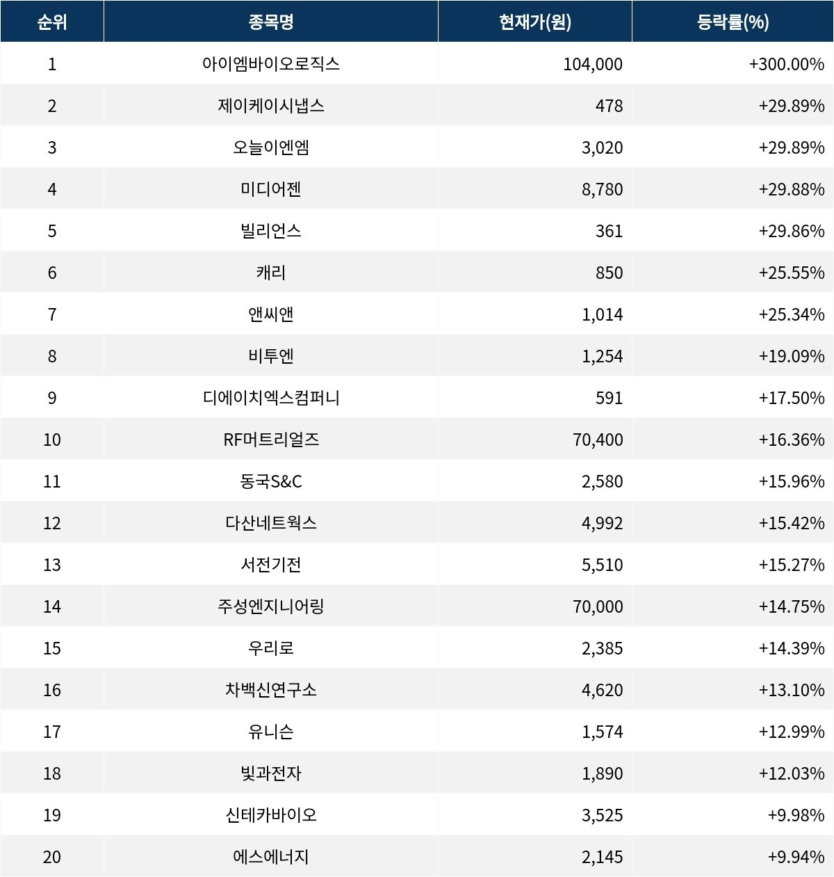 이어 상승률 2위 제이케이시냅스(060230)는 현재가 478원으로 주가가 29.89% 상한가를 기록하고 있다. 상승률 3위 오늘이엔엠(192410)은 현재 3020원으로 29.89% 상한가를 기록 중이다. 상승률 4위 미디어젠(279600)은 29.88% 상승하며 8780원에 거래되고 있다. 상승률 5위 빌리언스(044480)는 29.86%의 상승세를 타고 361원에 거래되고 있다.