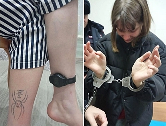 러시아 북부 아르한겔스크주 출신의 올레갸 크립초바(19)가 ‘테러 정당화 혐의’ 등으로 기소됐다. 전자발찌가 채워진 소녀의 다른 쪽 발목에는 블라디미르 푸틴 러시아 대통령의 얼굴에 거미 다리가 붙여진 그림과 함께 ‘빅 브러더가 당신을 감시하고 있다’(Big Brother is Watching You)라는 문구의 문신이 새겨져 있다. 2023.1.29 나탈리야 크립초바