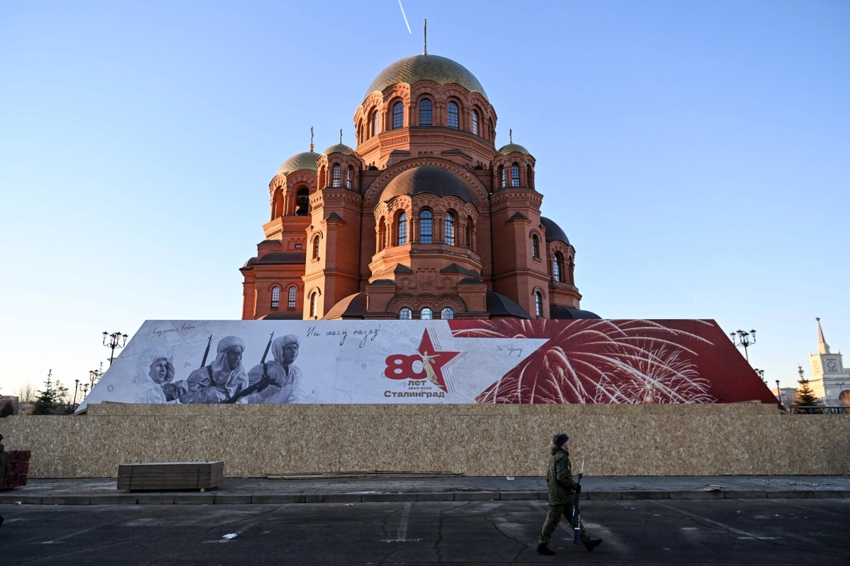 24일(현지시간) 러시아 볼고그라드 시내가 스탈린그라드 전투 80주년 기념행사 준비로 분주한 모습이다. 2023.1.24 AFP 연합뉴스