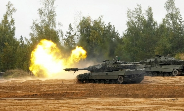 29일(현지시간) 라트비아의 아다지 군기지에서 실시된 북대서양조약기구(NATO·나토) 다국적 합동군사훈련 ‘실버 애로우 2022’에 스페인군이 레오파르트 2와 함께 참여하고 있다. 2022.9.29 로이터 연합뉴스