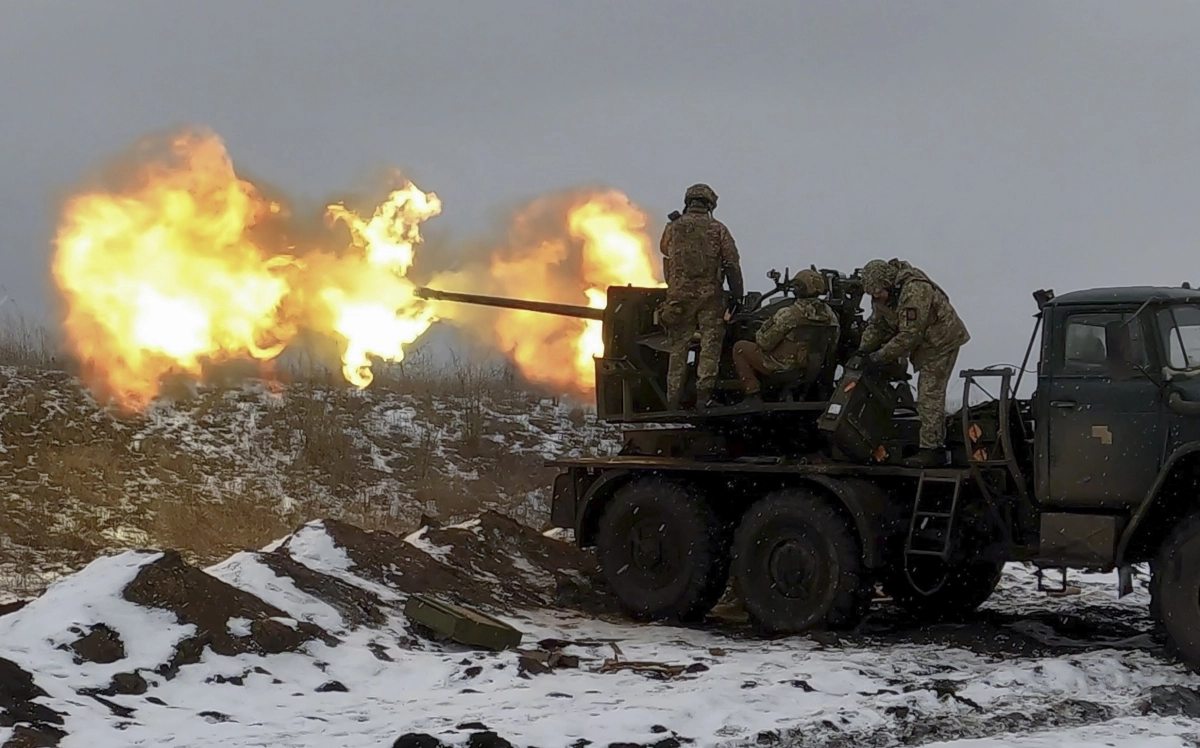 4일(현지시간) 우크라이나 동부 도네츠크 지역의 바흐무트 전장에서 우크라이나 군인들이 대공포를 쏘고 있다. 우크라이나군은 기동성 등 전투력 향상을 위해 구소련 S-60 대공포를 장착했다. 2023.2.4 EPA 연합뉴스
