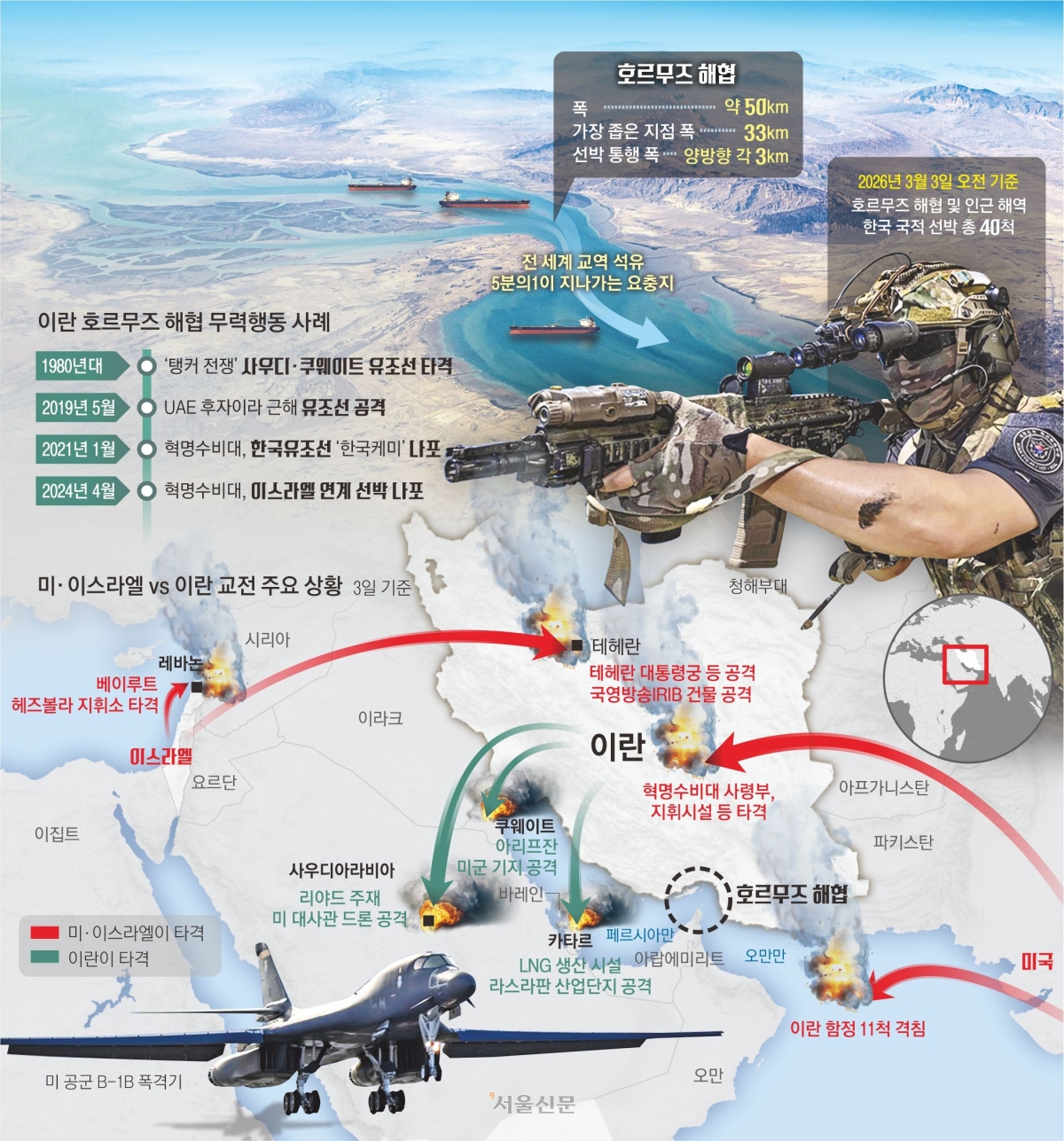 48시간 만에 1250여곳 초토화이란 이슬람혁명수비대(IRGC) 총사령관의 보좌관인 에브라힘 자바리 소장은 2일(현지시간) 이란 반관영 ISNA 통신을 통해 “호르무즈 해협은 폐쇄됐다”면서 해협을 통과하는 선박에 공격을 가하겠다고 밝혔다. 혁명수비대는 하루 2000만 배럴 규모의 원유가 통과하는 호르무즈 해협에서 “단 한 방울의 석유도 빠져나가지 못하게 하겠다”며 ‘글로벌 에너지 동맥’을 차단하고 나섰다.