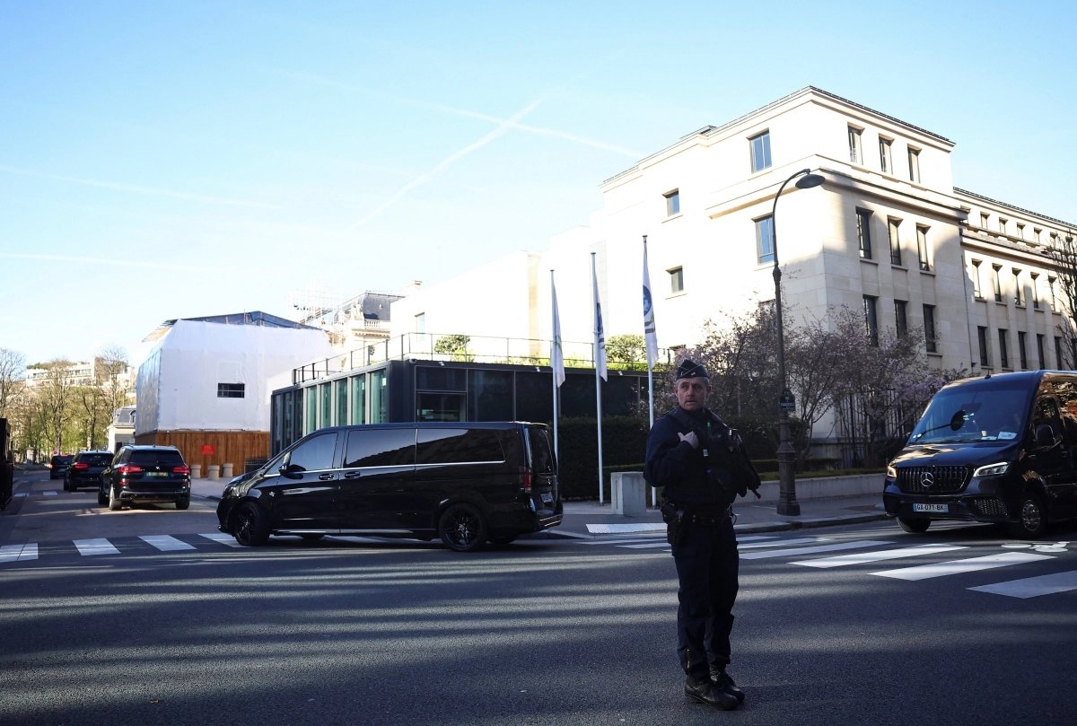15일(현지시간) 오전프랑스 파리의 경제협력개발기구(OECD) 본부에 미국 대표단 차량이 중국 대표단과의 무역 회담에 참석하기 위해 도착하고 있다.