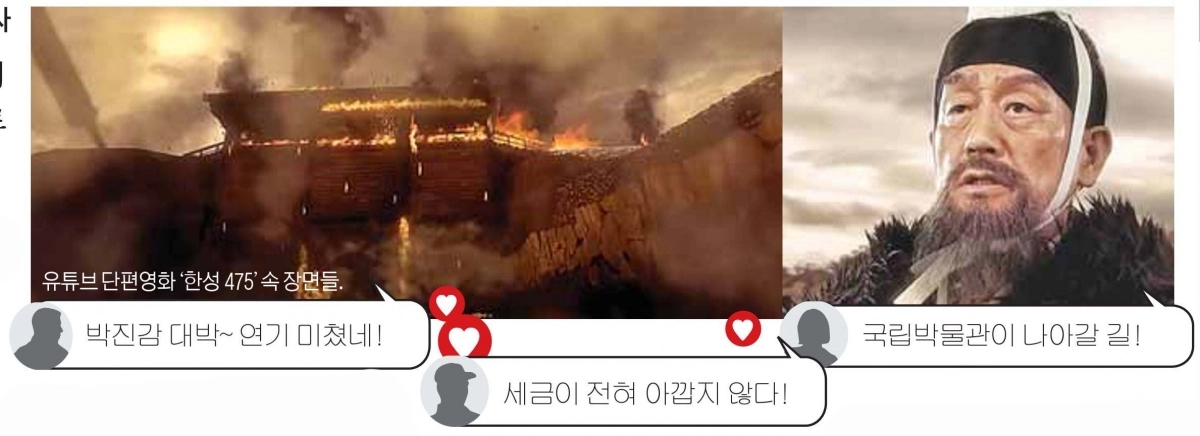 영상에 달린 2400여개 댓글은 칭찬 일색이다. “지나가다 결국 끝까지 시청했다”, “현실적인 전쟁 장면이 더 박진감 넘치고 재미있다”는 등 고증에 대한 찬사부터 “구천에 있는 장수왕을 살려 왔다”, “배우들 연기가 미쳤다”처럼 연기 상찬까지 긍정적인 댓글 천지다. “한국의 역사 콘텐츠가 나아갈 방향을 제시해 주어 고맙다”, “세금이 전혀 아깝지 않다”는 댓글은 공주박물관 관계자들까지 감동시켰다.