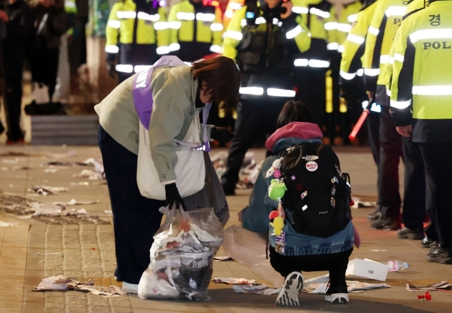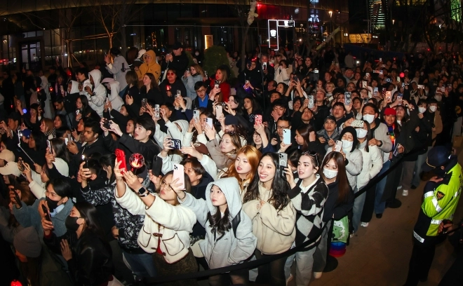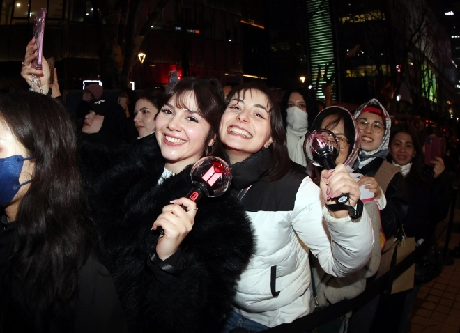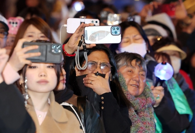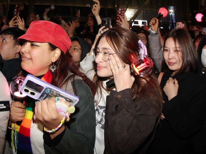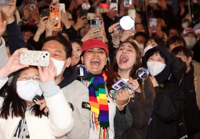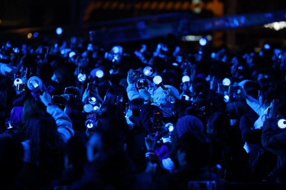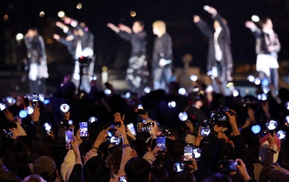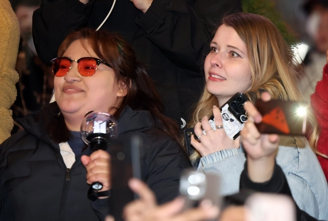 아미(BTS 팬덤)가 21일 서울 광화문광장 일대에서 방탄소년단(BTS) 컴백 기념 공연인 ‘BTS 컴백 라이브: 아리랑’ 공연을 관람 중 눈물을 닦고 있다.