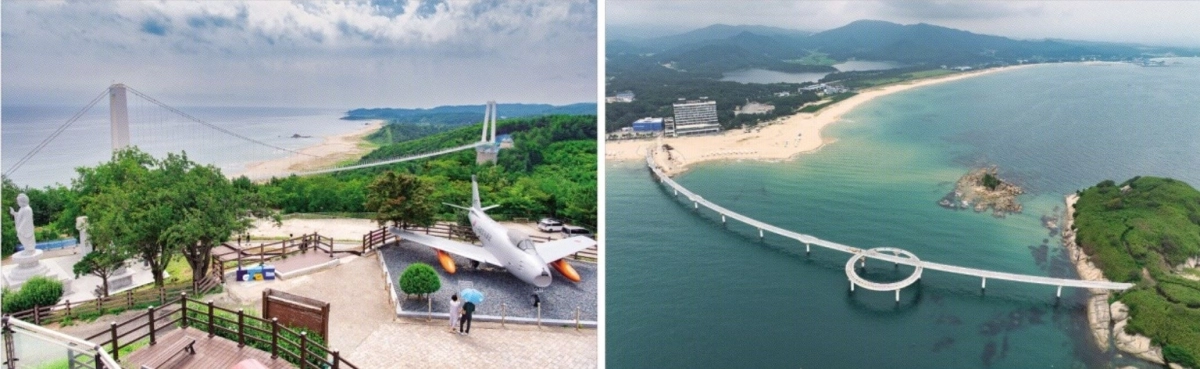 남부권에서는 해양관광 복합지구 조성 사업이 올해 마무리된다. 이 사업은 죽왕면 오호리 송지호해수욕장 일원에 육상, 해상 관광시설을 구축하는 것으로 국비 205억원, 도비 73억원, 군비 206억원 등 총 484억원이 투입된다. 해변에서 죽도까지 631m를 잇는 폭 6m의 해상길과 지상 3층 연면적 3171㎡ 규모의 레저 체험시설인 오션에비뉴로 이뤄진다. 해상길 중간 지점에는 바닥이 유리인 스카이워크가 있어 마치 바다 위를 걷는 듯한 긴장감을 느끼게 한다. 무인도인 죽도에는 638m 길이의 둘레길이 깔려 기암괴석, 대나무 군락, 에메랄드빛 바다가 어우러진 그림과 같은 풍광을 감상할 수 있다.
