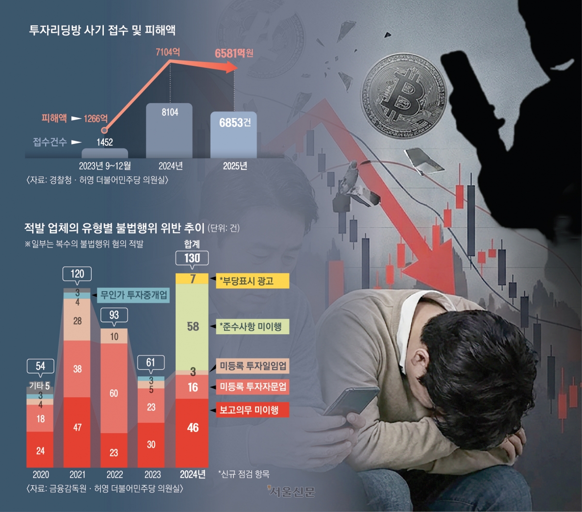서울신문이 허영 더불어민주당 의원실을 통해 확보한 경찰청의 ‘불법 투자리딩방·온라인 투자 유도형 사기 적발 및 신고 현황’에 따르면 2023년 9~12월 4개월간 투자리딩방 관련 신고는 1452건(피해액 1266억원)이었다. 첫 연간 통계가 집계된 2024년에는 8104건(7104억원)으로 급증했고, 지난해에도 6853건(6581억원)이 접수됐다.