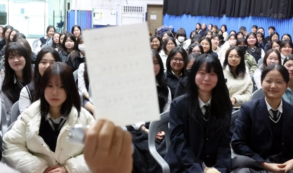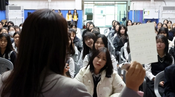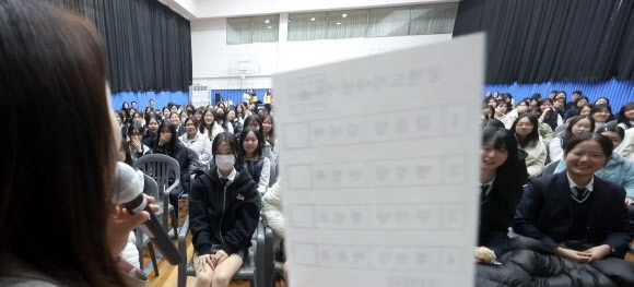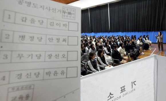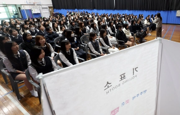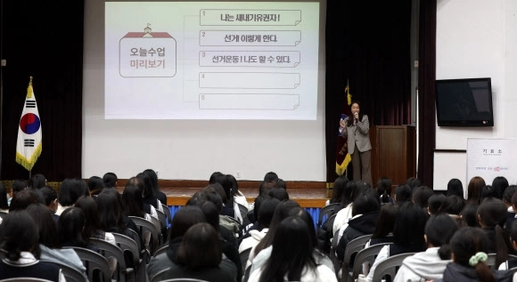 정치 [포토] ‘고3 유권자’ 대상 연수 입력 2026-03-16 17:18 수정 2026-03-16 17:18 기사 읽어주기 다시듣기 글씨 크기 조절 글자크기 설정 닫기 글자크기 설정 시 다른 기사의 본문도 동일하게 적용 됩니다. 가 가 가 가 가 프린트 공유하기 공유 닫기 페이스북 네이버블로그 엑스 카카오톡 밴드 https://www.seoul.co.kr/news/politics/2026/03/16/20260316800012 URL 복사 댓글 0 6·3 지방 선거가 79일 앞으로 다가온 16일 오후 경남 창원시 의창구 창원명지여자고등학교에서 경남도선거관리위원회 관계자가 고3 학생을 대상으로 ‘새내기 유권자 연수’를 하고 있다. 온라인뉴스부 Copyright ⓒ 서울신문 All rights reserved. 무단 전재-재배포, AI 학습 및 활용 금지