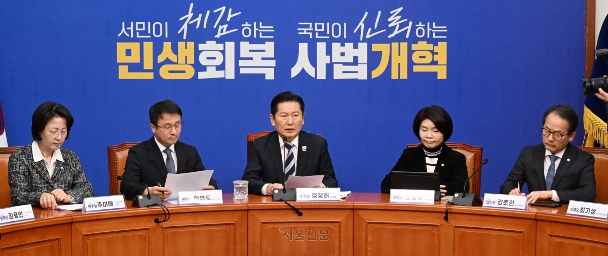 정청래 더불어민주당 대표가 17일 국회에서 검찰 개혁 입법인 중수청법·공소청법 관련 기자회견을 열고 법안 처리 방향에 대해 발표하고 있다.