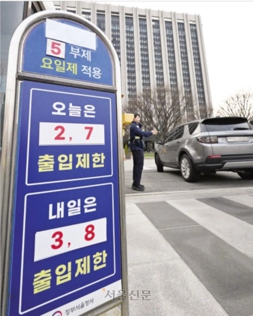 정부가 에너지 절약을 위해 25일부터 공공부문 ‘승용차 5부제(요일제)’를 의무화하기로 한 가운데 24일 정부서울청사 정문 차량 출입구 안내판에 오늘·내일 출입이 제한되는 차량 끝번호가 부착돼 있다.