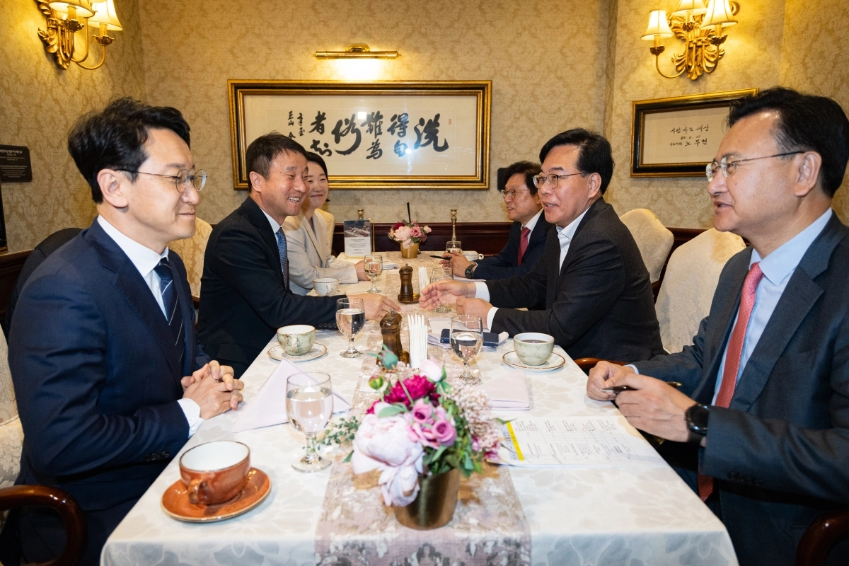 더불어민주당 한병도, 국민의힘 송언석 원내대표와 여야 원내수석 및 예결위 간사들이 10일 서울 여의도 한 식당에서 조찬 회동을 하고 있다. 왼쪽부터 시계방향으로 더불어민주당 천준호 원내운영수석부대표, 한 원내대표, 이소영 예결위 간사, 국민의힘 박형수 예결위 간사, 송 원내대표, 유상범 원내수석부대표. 뉴스1