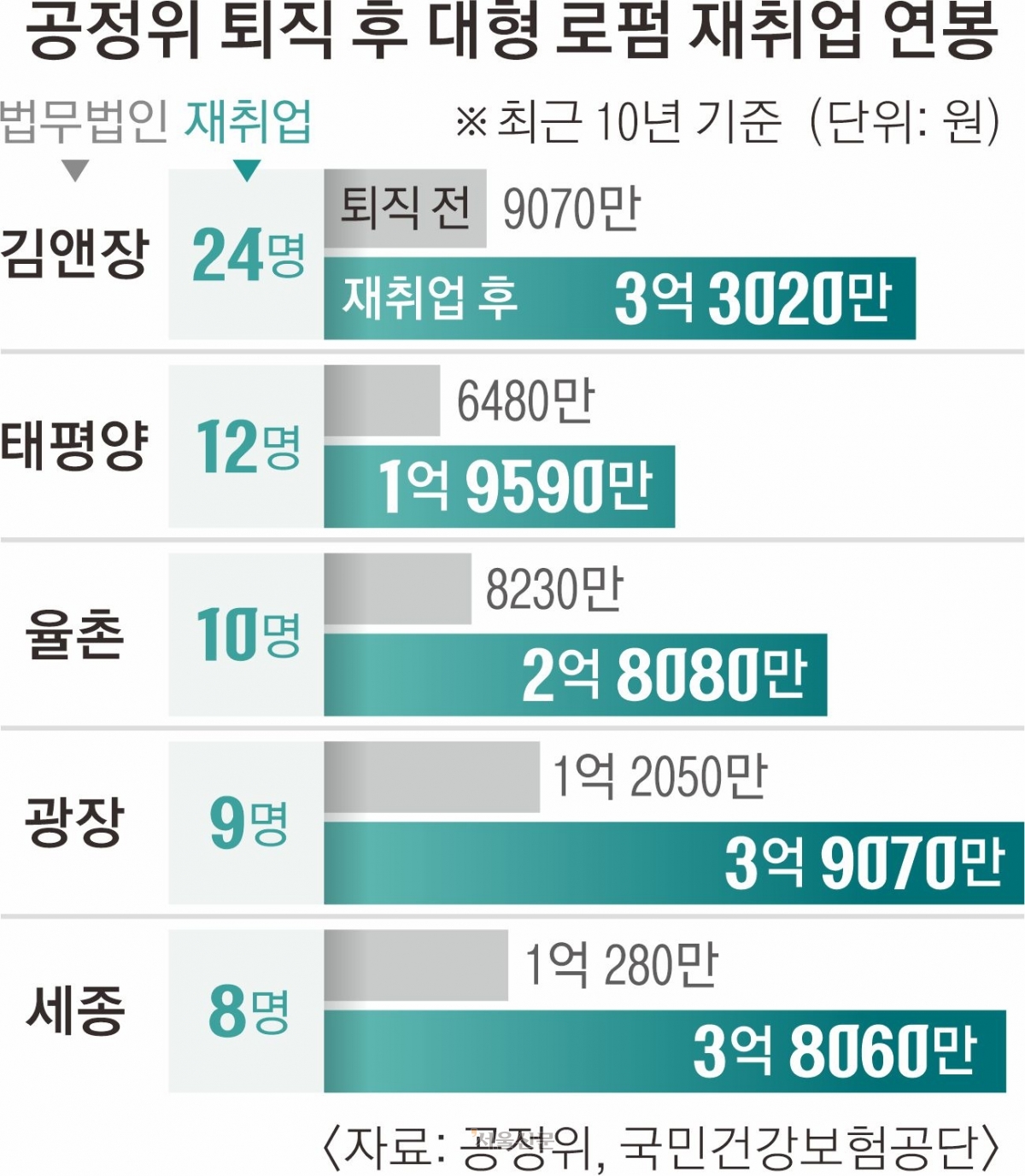 로펌으로 옮긴 공정위 퇴직자들의 연봉은 3배가량으로 늘어난 것으로 나타났다. 상승한 연봉은 화우가 기존 대비 374%로 가장 높았는데, 화우에 재취업한 퇴직자들의 연봉은 퇴직 전 평균 8370만원에서 재취업 후 3억 1340만원으로 뛰었다. 김앤장(364%)은 9070만원에서 3억 3020만원으로, 세종(370%)은 1억 280만원에서 3억 8060만원으로 증가했다. 같은 기간 공정위 퇴직자 가운데 대형 로펌 재취업을 위해 취업심사를 받은 인원은 18명으로 이중 5명은 ‘부당한 영향력 행사 가능성’을 이유로 취업 불승인 결정을 받았다.