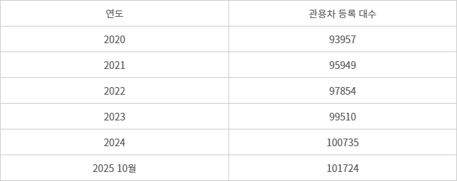 16일 KOSIS 국가통계포털에 따르면 지난 10월 기준 전국에 관용차가 10만 1724대 등록돼 있다. 2020년 말 9만 3957대였던 관용차는 해마다 2000여대씩 늘며 2024년(10만 735대) 10만대를 돌파했다.