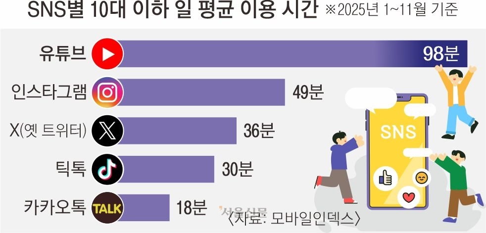 호주가 세계 최초로 16세 미만에게 소셜미디어(SNS) 사용을 금지한 가운데 우리나라 10대 청소년들도 매일 평균 90분 이상 유튜브를 시청하고 50분씩 인스타그램을 쓰는 것으로 나타났다. 우리나라에서도 청소년의 SNS 사용을 규제하자는 목소리가 나오는 만큼 사회적 논의 과정 및 정부 입장에 이목이 쏠린다.